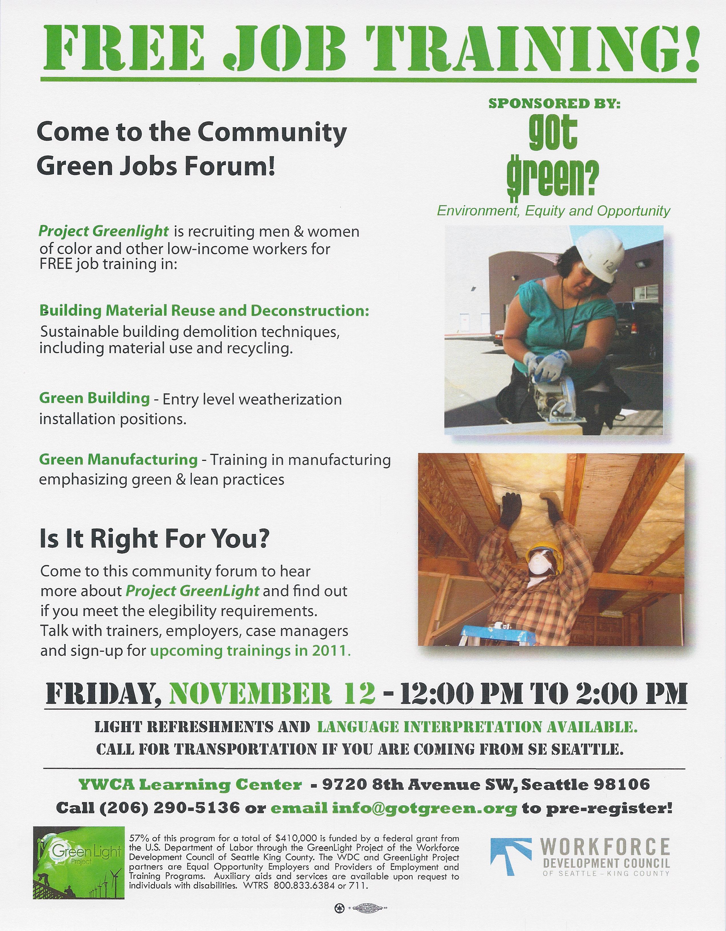 Community Green Jobs Forum in White Center, November 12!