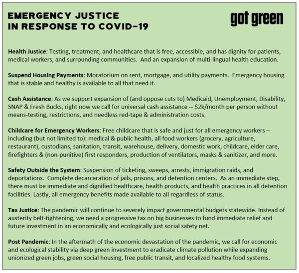 ------Got Green expresses our appreciation for the emergency action that has taken place thus far: moratorium on evictions & utility shut-offs, no fare enforcement on public transit, expansion of food security dollars, and more. All of this was made possible due to public outcry and our histories of demanding justice. We know that WA State and local governments can/must do more. As visionary as the above demands are, we realize that they are woefully incomplete and that federal action is absolutely necessary if we are to see the relief we need and deserve. Got Green will do our best to lift up other calls for justice -- for example: canceling debt, free municipal broadband, safe food deliveries to our homes and more. ------Got Green's demands for emergency justice builds off of and is inspired by the inspiring work of many groups and individuals -- thank you: People’s Action, Working WA, Detention Watch Network, La Resistencia NW, COVID-19 Mutual Aid, Council Members Tammy Morales & Kshama Sawant, and more.-------------------------------------