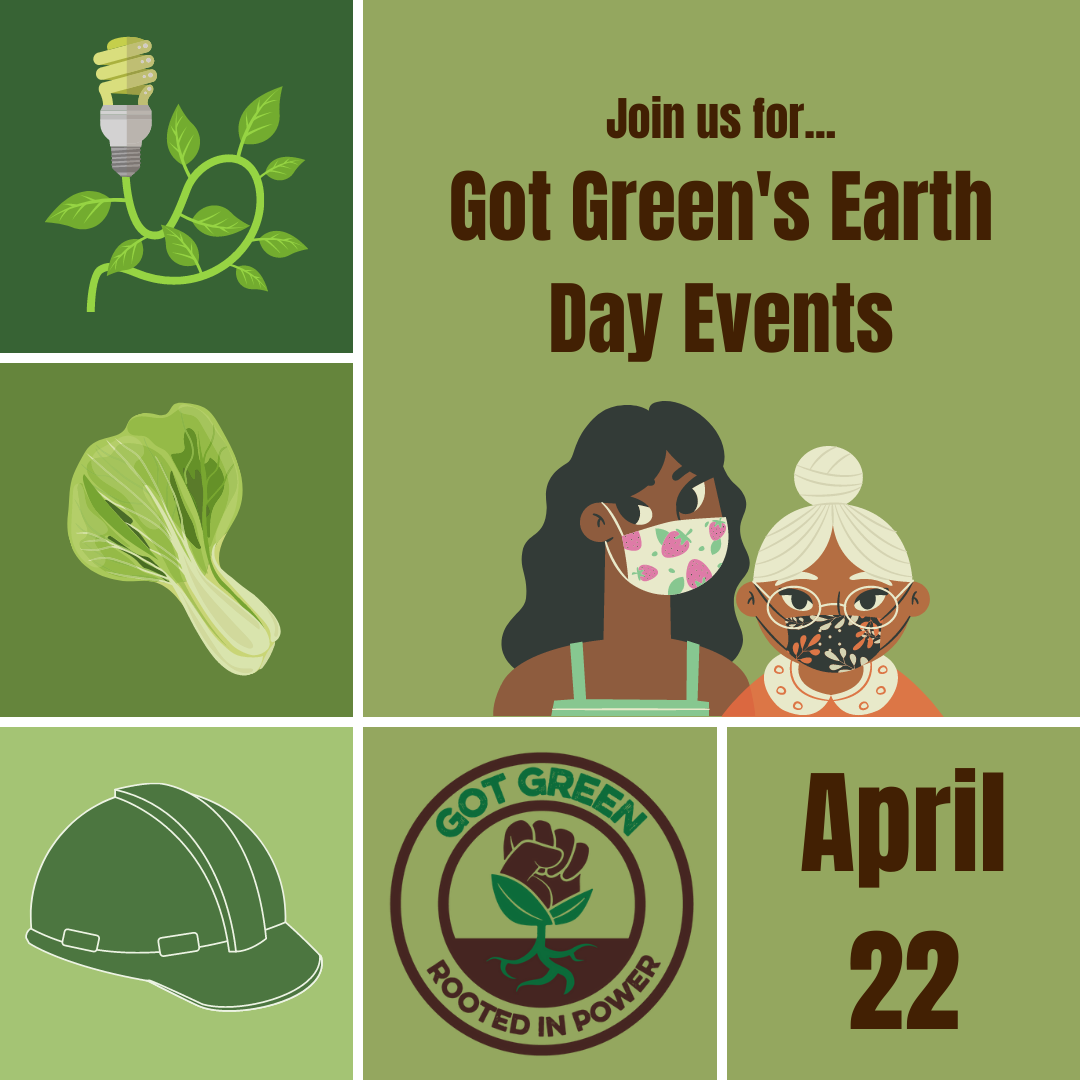 Thank you for registering for Got Green’s Earth Day events on April 22 - this Thursday. You will find the details for our events below, including times, locations, safety protocols for in-person events, and links. For the in-person events, we recommend you wear comfortable clothes and bring a water bottle. Lastly, we encourage you to invite your friends and family -- we're stronger together!-------