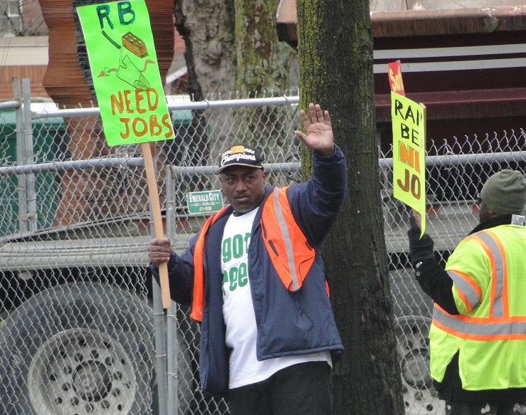 [caption id="attachment_1131" align="alignright" width="310" caption="Ed Mayer pickets the Rainier Beach Community Center job site in February to demand targeted, local hiring."]